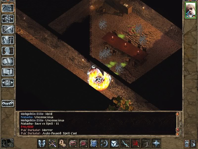 Arzamraphel and co. more or less cleared the Gnoll Stronghold. The Tome seems to have been Randomised, and I decided not to pick up Dynaheir - at least not yet. Experimentation with a quicksave told me she would be a L7 Invoker, probably with more health than Imoen. However, I'm dubious about her low Dex. I'm tempted to take the "full cannon party", but with Imoen as a Sorcerer I think I'm going to need to take on someone like Safana, at least as a temp, before too long (was thinking of dualing her from Swash to Mage, but I really need someone to sort the traps in the Mines and eventually Durlag's Tower etc).