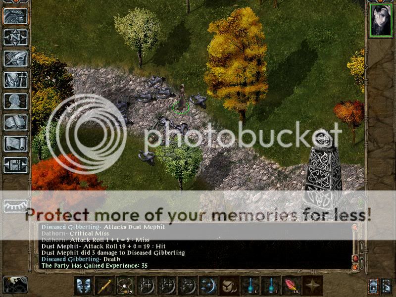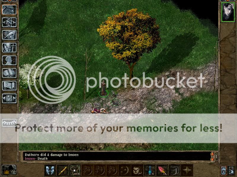They hadn't walked a stones throw from the walls of Candlekeep before Gorion and Dathorn were set upon by an ambush. Rather than throw his life away, Dathorn was quick to find cover as his mentor and foster father fell under attack and died. After a miserable night spent in the rain, with several liberal beatings administered to Soot with his walking stick to stop the mephits bitter complaining, Dathorn awoke to find that the urchin Imoen had tracked him via the trail he and Gorion took.