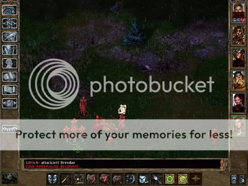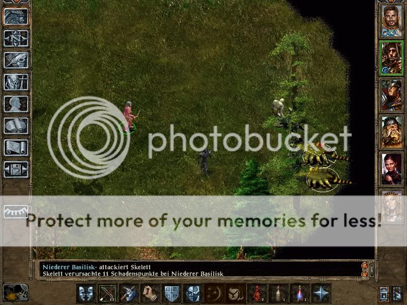 After a whole day of sleeping in Feldepost’s Inn party went to do some shopping at the smithy. With 5 reputation prices where really outrageous, but they where buying only cheap stuff anyway – studded leather fo Imoen, sling +1 and a large shield for Montaron and lot’s of ammo. Killing some ogrillons south of Beregost was rewarded by a ring of protection. Ignoring Xzar suggestions of going to Nashkel, Mrtyudasa led the party east, trying to find Shar-Teel. He chose a wrong direction however, going through the Larswood. East of Larswood party was ambushed for the first time.
