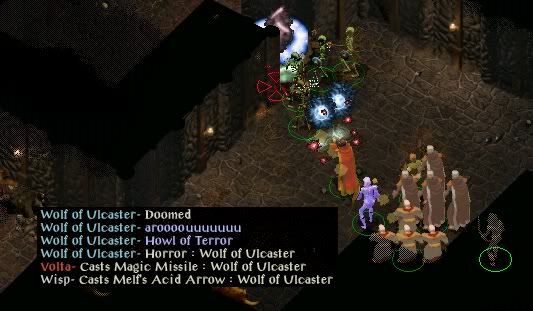 Party had no trouble with the wolf pack in the temple area and moved on to Ulcaster. In the initial combat with Icharyd the party used only their own resources, but once the second stage started the weakest 4 used some protection from call lightning and then tried to take him down quickly. As it's hard to get through his magic resistance the main contributors here were summons - dire wolves and then ogres (they were also handy for soaking up some of the lightning strikes).