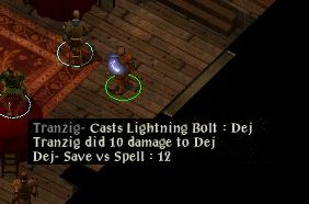 - the basic plan of approach with Tranzig was the same, but I got a bit careless with Tranzig and mistimed one of the exit transitions. That allowed Tranzig (operating by script) to follow him while in the middle of a lightning bolt spell and fire it off (the bolt damage only taking effect as he moved back through the door the other way). Dej also was rather poor with his staff after Tranzig was out of spells, so actually got hit twice before eventually finishing him off.