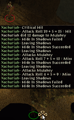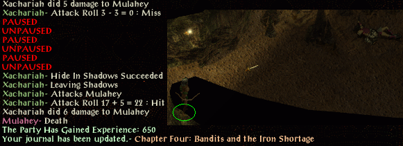 Nashkel mine stinks. I take advantage of the shadows to return a dagger to Kylee and head into the depths. Two traps on a bridge hurt (12 + 11 leaving 8/31hp and leaving the shadows). I manage to dodge a kobold arrow and hide once more, then rest in shadows.