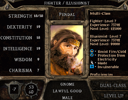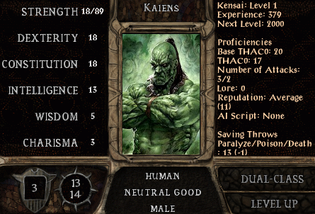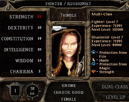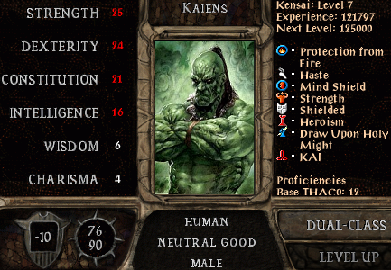 Ashoka – fighter 6/druid 6, 74 HP (with Helm of Balduran), fav. spell: