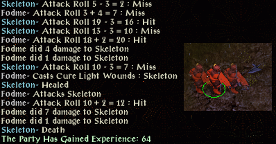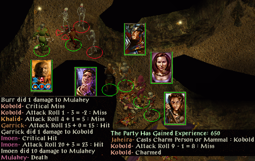 Protection from Undead scroll. Didn’t find any, so went west and robbed a little girl. Got ambushed by 3 skeletons – one with bow, one with darts (or throwing daggers), but none hit – and then by gnolls – charmed one to outmaneuver them and escape. Went to the mines, sneaked to Mulahey, charmed him, got him killed by kobolds. Almost failed, as Mulahey had morale failure and went berserk. Good thing I changed his weapon to fist – he just knocked out one kobold before dying.