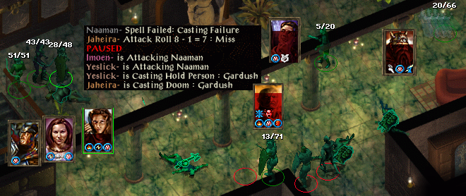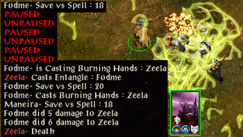 So, I was now keeping the hobgoblin on a shorter leash – I ordered him run around the fighters (to be honest, I was hoping he’ll have a heart attack), paralyzed second doppelganger. Belt managed to kill one non-paralyzed doppelganger and died, while I paralyzed another and cursed hobgoblin finally disappeared. Only one enemy remained on the move. He charged at me, but I paralyzed him in the next round. Then I paralyzed the emotional one. And just in time – a moment later spell have expired. Guards woke up and killed paralyzed doppelgangers.
