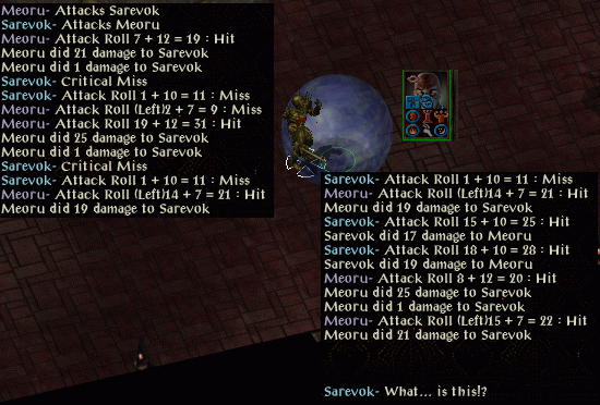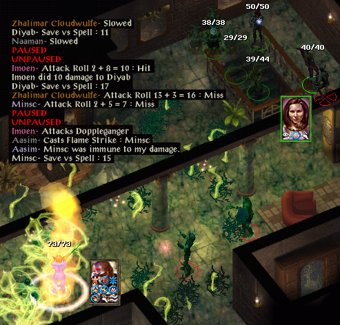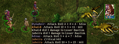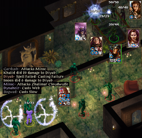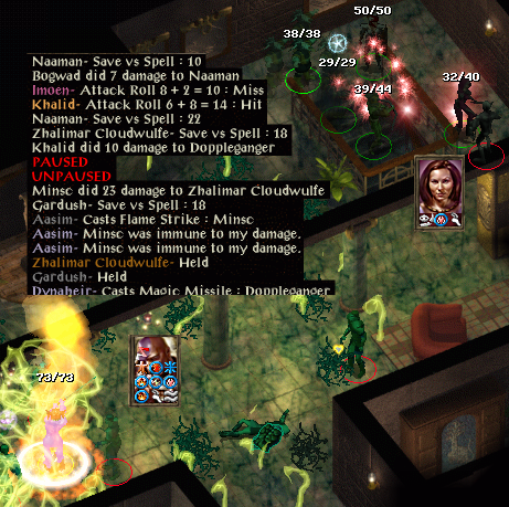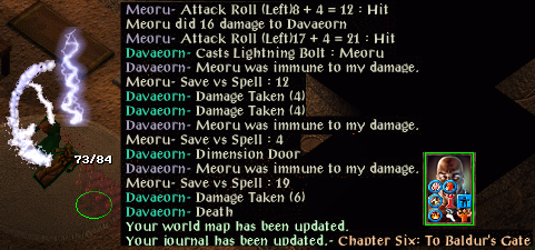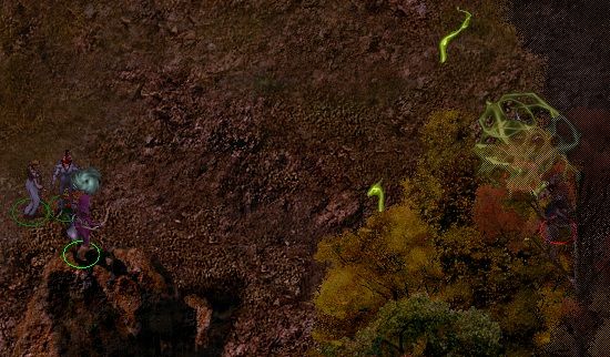 At the Carnival I gained the ability to heal myself somewhat. I then decided that perhaps Beregost might be safer. At Beregost I calmed down Marl and took a book to Firebead. I then headed south at Mirianne’s request to get news of her husband. With the ring given by Lord Foreshadow, I charmed an ogrillon and got it to fight another whilst attacking the hostile one with Sunfire. Continuing on, I met a member of the Flaming Fist. He thought that I was a bandit, not surprising since I was accompanied by an ogrillon. In the ensuing fight both of them were killed. I returned the letter carried by the ogrillon to Mirianne and received a ring of protection as a reward. I stumbled across some spiders which followed me inside an inn. I used Lord Foreshadow’s ring to charm Algernon into helping me against them. He died and I used his cloak to charm a Morninglord. Between us we killed the spiders, but the Morninglord sadly died. His armour is most helpful.