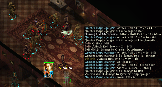 Vincris is sent back to Candlekeep and gifted a ring from Koveras (I can't remember asking anyone to hand something over) before being framed for murder. I influence Tethtoril too, and he releases Vincris into a secret library. A bit more concentration ensures he uses the scroll and strength potion to loot a trio of tombs, then he backstabs a doppelganger of myself. More backstabs drop Prat and his gang (starting with Bor). His mirrored eyes potion is a wise precaution, ultimately not needed given the speed of backstab retreats into shadows against a pair of greater doppelgangers.