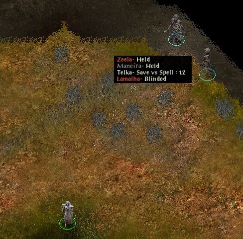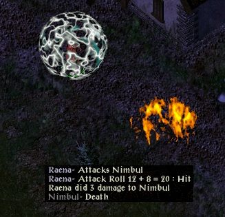 Back in Nashkel she lost track of Nimbul after a round of magic missiles on him and spent quite a while wandering round before he finally attacked. Raena had a potion of magic blocking for emergencies, but Nimbul never cast anything that could get through MSD and the elemental damage from MMM through his stoneskins finally laid him low.