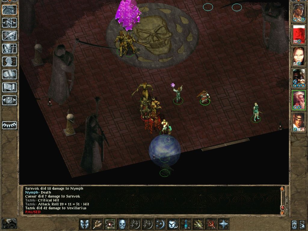 I decided I should fight on reasonably level terms with Sarevok, rather than just splat him, so only Caesar and Optio used spell protections initially. Legate got targeted with a stoning spell and quickly gulped a potion of magic shielding. Then Tazok appeared with a bang, while Centurion got confused by a chaos.