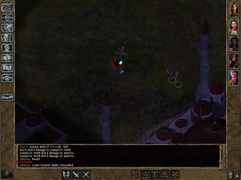 Revived Imoen at FAI, attacked by Tarnesh at the steps. Guards claimed the kill. Picked up the ring of wizardry, Jahiera and Khalid joined and the group dispatched the hobgoblins north of the inn with no troubles, rested, then head South. Imoen and Jahiera both gained a level on a pair of dread wolves.