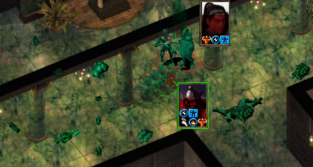 Continuing the exploding arrow barrage while running rings round the skeleton warriors got rid of them leaving only Sarevok and Angelo (who was still invisible). Ego attacked Sarevok with backstabs - even after his potion of speed ran out he still had a big speed advantage from his boots, so didn't even need to use the pillars. With Sarevok at near death, Angelo finally deigned to make a move. This time Ego did use a pillar to hide from him and then tried using his 3 remaining dispel arrows on Angelo. The first missed, but the second took effect.