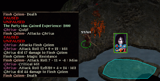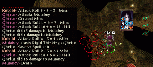 Stari did mention early on it would be nice if she didn't have to patronize the temple this run. That naturally induced a second level Maldor to attack a group of about 8 ghasts, ghouls and hobgoblins to demonstrate his natural immunity to hold. He did, indeed, demonstrate that, along with the fact that 20 HPs doesn't last long against multiple attackers.