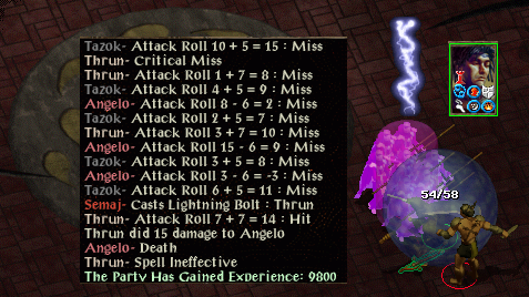 There were no further problems for a long while as the duo worked through most of the map areas before turning their attention to the Nashkel mine. Mulahey there was one of many victims thrashing around blindly wondering where the next attack was coming from. Stari was pretty much untouched through this period, though she did take one hit shortly after exiting the mine. Lamahla and her crew were treated to multiple webs and then 3 of them were blinded before Stari ran out of 1st level spells. Telka managed to break free of the web and do a bit of damage before expiring of magic missiles. Maldor then took significant damage himself and was looking round to see who did it (actually storm damage, though I was just too slow to capture the lightning on the screenshot).