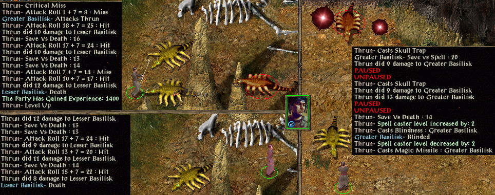Marl, Firebead and some ogrillons and hobgoblins to the south saw level 3 in with 8 more HPs. Down to Nashkel to pick up an armour upgrade and buy a scroll of protection from petrification before moving on to the basilisk area. Killing the basilisks there got Crock to level 4 (15 HPs) and then level 5 (15 more!). Managed to spot where Mutamin was without alerting him and I sent Korax to deal with him. Mutamin saved against paralysation once and then Korax got distracted into attaking a basilisk so Crock moved to the edge of the map expecting he would have to depart. Fortunately Mutamin didn't bother using many spells on Korax and he was able to kill the basilisk and still survive long enough to paralyse Mutamin. That allowed Crock to come back to kill the second greater basilisk as well.