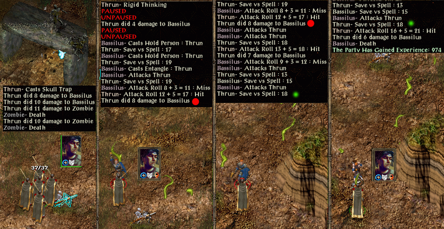 No further problems for a while after that. The Iron Throne party was killed rather than bypassed as we were still pretty low on XP. However, as only Zhalimar and the doppleganger could still see after Stari had used some pillars to hide from the former, they had no chance. After collecting the treasure from the Candlekeep tombs the intention was also to deal with Prat's party. However, Prat saw Maldor before preparations were made and the fight was thus rather fairer than many. Maldor was still protected by the scroll of magic protection used for the tomb traps, so was happy to enter the fray. However, he was given a nasty shock by Bor (he was wearing ring of free action, but it appears that doesn't protect against stun in this installation). Stari saw no way to intervene safely, so settled for picking up the less easily replaced equipment and returning to the city to find a temple.