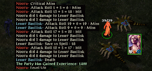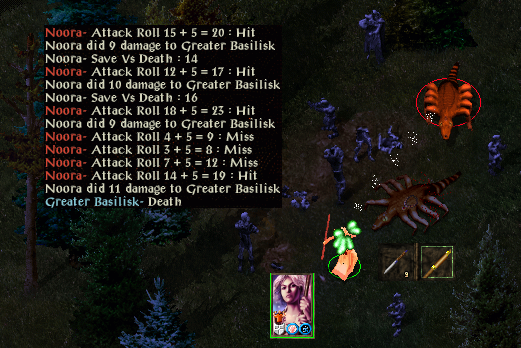Two lesser basilisks are killed, Tamah freed and two more lesser basilisks killed. One slight hiccup, but after a rest more basilisks are encountered. After killing a greater basilisk Noora runs from a remaining lesser basilisk as she cannot remember how long her PfP has been active. On her return a PfP casting goes horribly wrong (as does the screenshot : flesh to stone, save made with 18. Edit, just found it - here) but after resting and a couple more hiccups she gets it right and finishes two more lesser basilisks. Another rest is taken before heading up to a bear-gazing basilisk, then Noora decides to leave the remaining two basilisks and Mutamin until she has suitable spell protections.