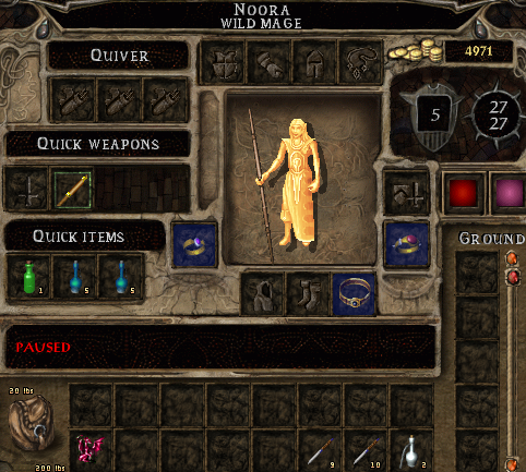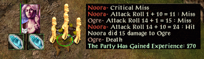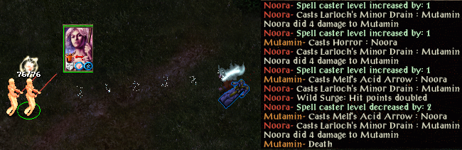 I start with Shield and Larlochs Minor Drain and soon learn ghoul touch. Caldo and a cave bear fall victim to this but a belted ogre has to be left wounded while Krumm takes my entire spellbook plus an entire Wand of Missiles.