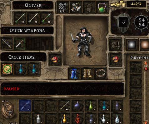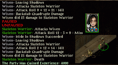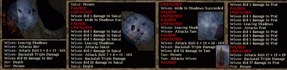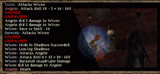 A shadowy arrow dispels the haste from Sarevok but Angelo and Semaj have reacted. Wiven just manages a PfM scroll in the nick of time and hides. She attacks again without thinking then manages to hide on the fifth or sixth attempt (Semaj, Angelo and Sarevok all have lines of sight to avoid). Glug glug glug sees 2 mind focusing, 1 defence, 1 speed and 1 fire potion consumed (OK - glug glug).