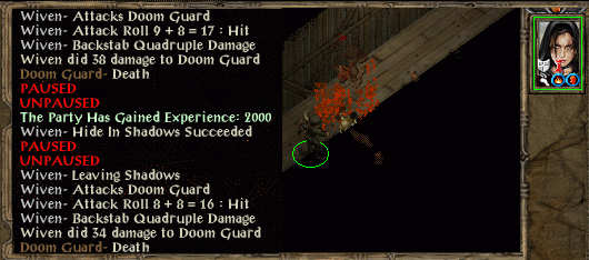 Back to the city where Slythe is taught a lesson in backstabbing. Wiven just has time to hide and poison backstab a greater doppelganger before switching to arrows of piercing. A few of them chase her upstairs and the rest are shot on her return downstairs. Belt notices Liia has perished so begs for Wiven to chase after Sarevok.