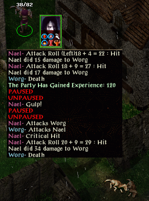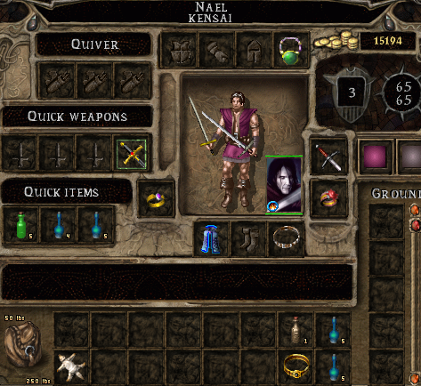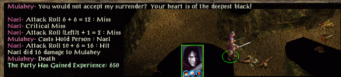 After storing Joseph’s ring outside (can’t open the house door) a suit of armour is sold and Berrun Ghastkill takes the holy symbol of Mulahey. With 3 inventory slots left Noora returns for the flame arrows plus a longbow and splint armour. A rest to identify items is followed by a sale so the familar can be backpacked once more. Remove Fear and Shield are cast before approaching Nimbul, then a combination of
