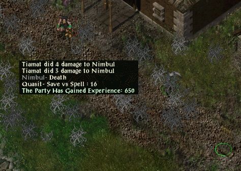 When Trint returned to Nashkel, a powerful assassin named Nimbul appeared. Trint tried numerous times to poison Nimbul with his arrows, but failed, taking some magic missiles in return. Each time, Trint had to run and heal, even make a stop at the Nashkel Temple to restock on heal potions. The Nashkel Guards tried to help, but all that assisted were either ineffectual or killed. While killing a guard, Trint heard Nimbul say, "It's almost wrong to have have such an easy kill.". Eventually though, Nimbul's mirror images wore off (Trint waited them out) and when they did, Nimbul was destroyed.
