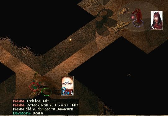 After travelling invisibly through the Cloakwood they attacked the party at the mine. The 2 nymphs held Drasus at the start and, after a hail of MMM from Charel helped kill the casters, they did the same for Genthore to make for an easy finish. The duo sneaked down to Daveorn and pulled back the battle horrors to their doom. Daveorn came to investigate the noise, prompting Nasha to swallow a magic-blocking potion and practise her criticals on him. There was just time to rue the fact that a hasted werewolf shape is not good at setting off traps, but fortunately the glyph didn't wound Charel too seriously.