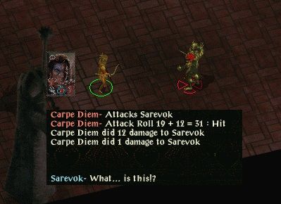 Coretrue tries to shoot Nimbul and go into the store, but his arrows still not connecting, and Coretrue has ran out of heal potions. So Coretrue uses his last haste potion and runs to the Nashkel Temple. Coretrue gets 10 potions and decides to resurrect Wewa, while Nimbul is still outside waiting for him, because Coretrue just happens to have thief useable equipment for Wewa (the duo had to go back to the mines as the forgot to loot all the letters, so Coretrue had a few items from a dead kobold). Coretrue gives her some heal potions and the thief weapons, and the head outside. Nimbul puts another set of missiles into Coretrue - Coretrue uses a blue potion - oh, Nimbul using axes - we have him! Coretrue charges with his bastard sword +1 and slays the annoying Nimbul. Boots going to Coretrue.