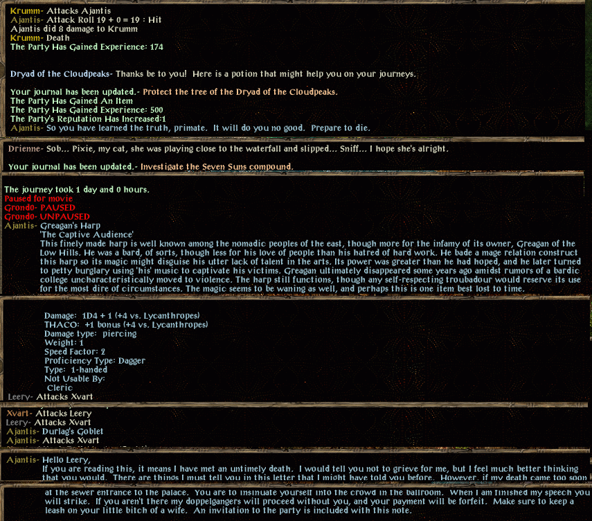 While Dogdancing understands the theory, she would really not being doing BG 1 again. So she asked Corey_Russell if we can speed things along this run. With that in mind, we are not looking for experience, per se, but rather moving the main story along whenever possible.