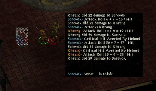Ajantis / Khalid / Mayhem / Imoen / Jaheira / KivanImoen hands over 200gp and watches intently as Kivan is brought back to life. Ajantis is distracted from his Helmite praying in this temple of Helm, turning angrily as Imoen lowers the tone “Poor sod, taking a dirt nap thanks to that gnoll noticing his lack of helmet and determination to fight with his bow”.