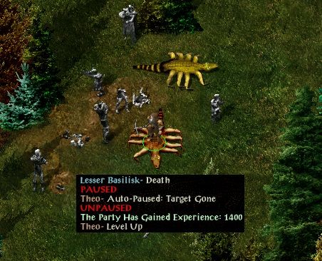With the green scroll of protection from petrification in hand the Crew made their way north (Arghain's sword for 2-H and saved Hulrik's cow) then west to Firewine Bridge (Bentan's scroll & Meilum's bracers) before proceeding to the basilisk area. As the one with the best weapon (composite long bow) 2-H took the bracers and soloed the basilisks. At the start of the area everyone was nearing level 2. Killing the separated basilisks got everyone to level 3. Korax joined in to help with Mutamin, but I decided to leave Kirian's party alone for now.