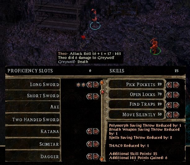 The standard start generated a couple of levels each from Shoal before travelling via Beregost down to Nashkel. Hulrik's xvarts provided a stern challenge - not so much themselves, but the various ogres, wolves etc that were picked up during the contest. However, plenty of running and shooting eventually cleared things and the duet moved on to Meilum - he went rapidly down in a spin.