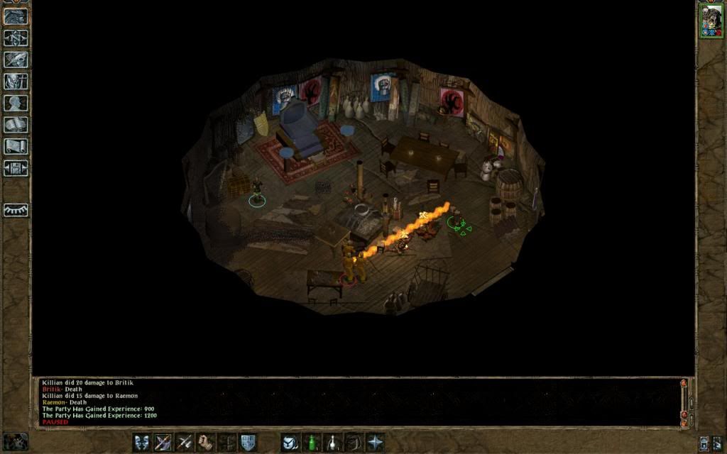 Greg's gang went straight into the main tent (3 invisible and Imoen stealthed). Inside Edwin put down webs and the party proceeded to kill the helpless enemies. Outside, just killed a few bandits and Taugosz - Jaheira taking his armour.