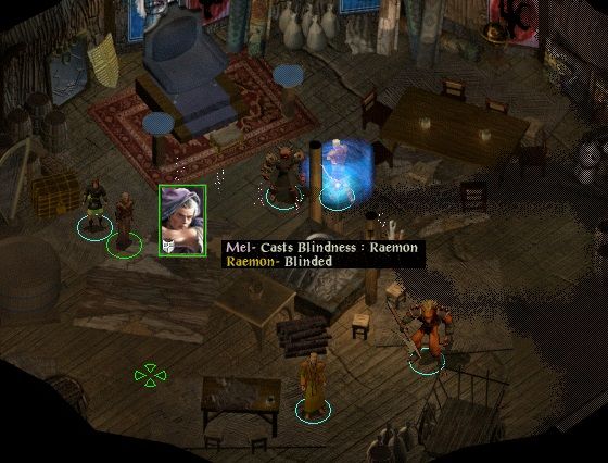 Viconia casts True Seeing, skeletons attack, Slythe turns red, Krystin obliterates many skellies, guests and courtesans with a Sunfire (not all skellies, because I had kept some in reserve, and Viconia soon conjured up another pack) and Edwin threw a perfectly placed Malison. Oh, Krystin hit Slythe with the Sunfire, too. Some lover! Eileth summoned animals. Some skeletons and animals caused Krystin to move out of sight and some others kept Slythe busy. Viconia saw her chance and fired off her wand: