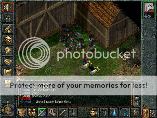 The other woman, a mage, caused us more difficulty. She opened with a damaging Sunfire and she attacked Coran with Melf’s Minute Meteors. Coran did what he seemed to be best at, or maybe second best (after flirting): dying. My elemental arrows and Khalid’s and Jaheira’s sword attacks helped us prevail. (At one point a Hamadryad, summoned by Fadorn, had even managed to charm the woman, but that effect would be nullified by the party's physical attacks.)