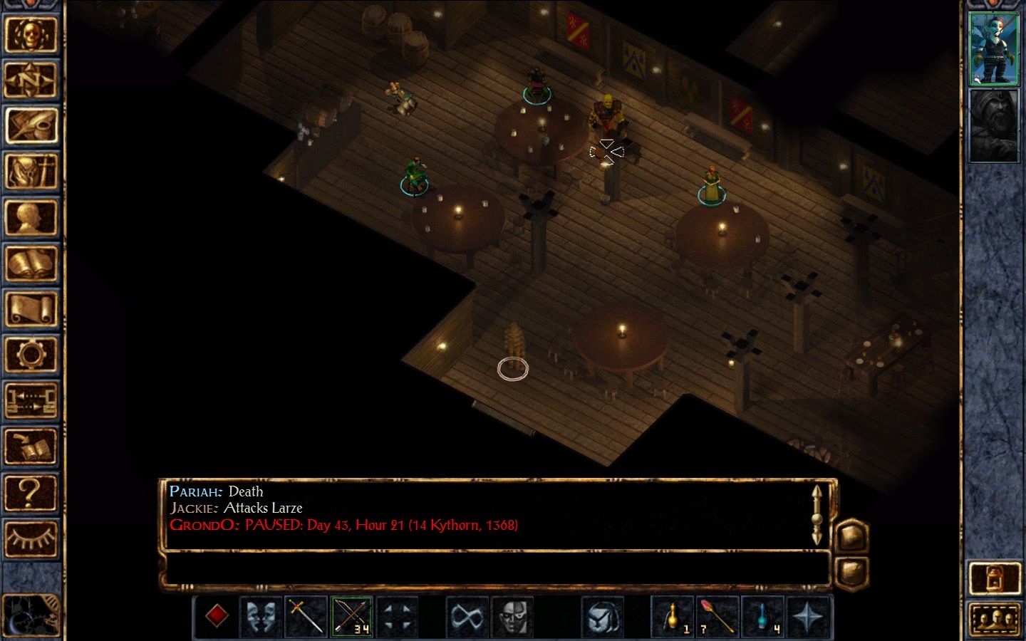 Moving on to Baldur's Gate, Jackie took advantage of the dexterity tome before Pariah went after the wisdom one. Jalantha failed to cast a spell under assault by skeletons and the pair headed for Marek. On the way there was a minor disaster when they confronted Larze and he took advantage of lag to reach across the room and snuff out Pariah. After getting revenge with a few backstabs, Jackie took Pariah's body to the temple before the pair returned to collect equipment and rest. Finally they were able to come to grips with Marek - or at least the skeletons were and they ignored his confusion spell to finish him off.