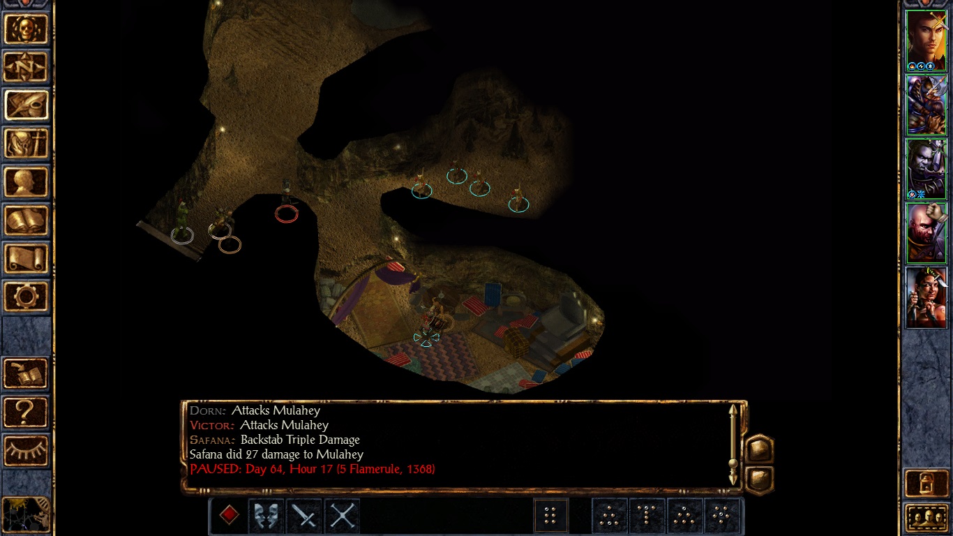 Not far from the place of battle three Hobgoblins threatened to kill us if we didn't hand over our gold. Normally a few Hobgoblins wouldn't be worth mentioning here, but these three were sturdier than most of their ilk, and besides they were aided by more Hobgoblins (elite archers) and three Ghouls. I commanded my men to retreat, but too late, as Dorn got held. I tried to fight off the Ghouls before they would kill Dorn, but then I too, got held by one the Ghouls. I was in good health and thus free from immediate danger, but I feared for Dorn, whose injuries were grave. However, Kagain, Rasaad and even Safana did what I hoped they would do: they fought off the Ghouls first, preventing them from killing Dorn, and then finished off the Hobgoblins, who were less of a threat to us. In a way this has been a good test of the loyalty of my followers, and I'm glad to say they did not disappoint.