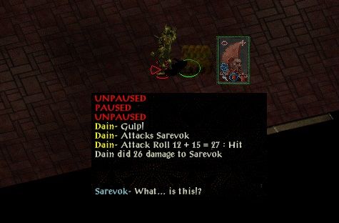 Sarevok was pulled out alone, but an initial shot with a dispelling arrow missed and he got one attack in on Vargus before he took a potion of invisibility. St John did the same and both of them buffed up before ganging up on Sarevok. He didn't like that at all and only had time for 3 attacks of his own (all of which missed) before making a run for it.