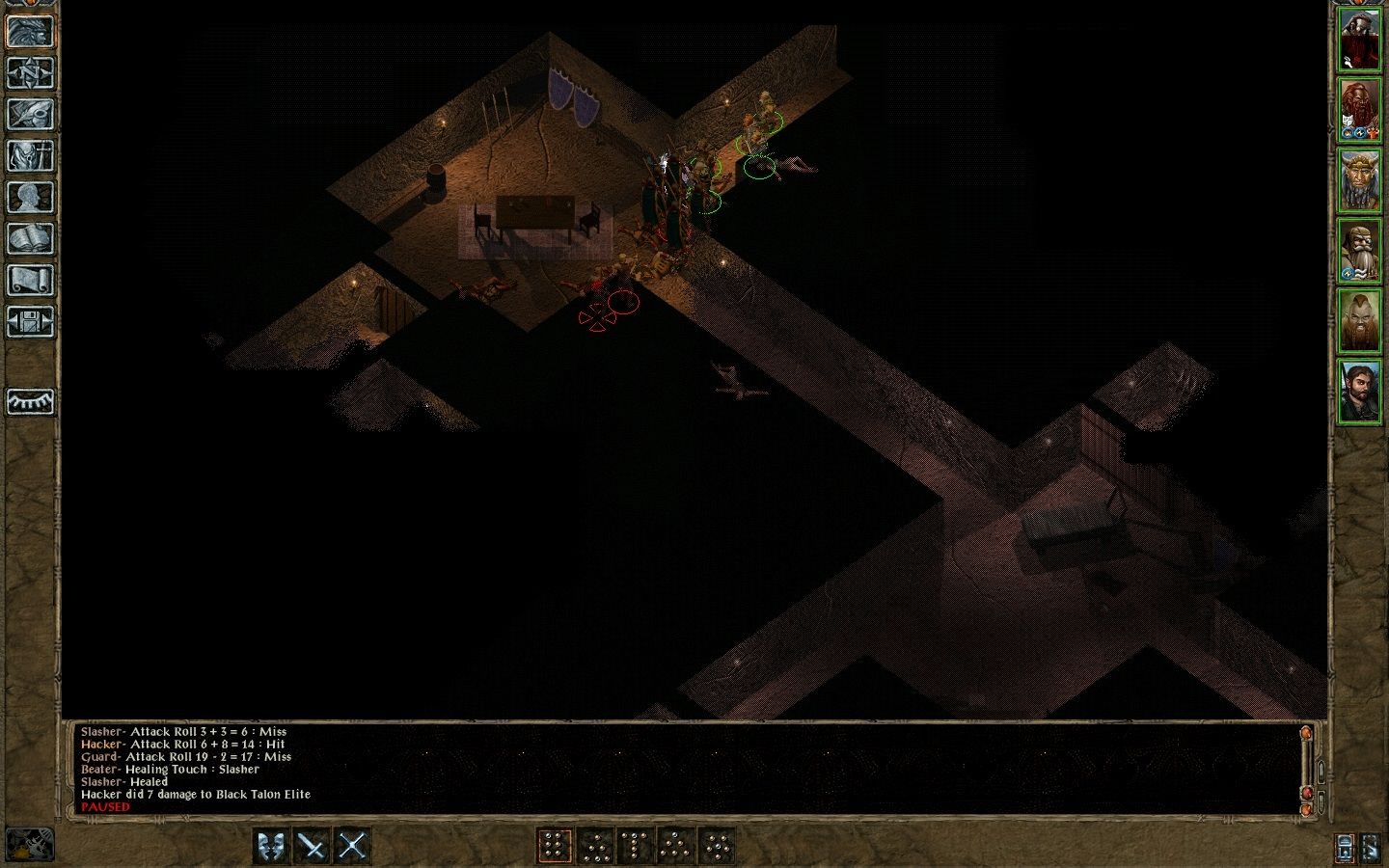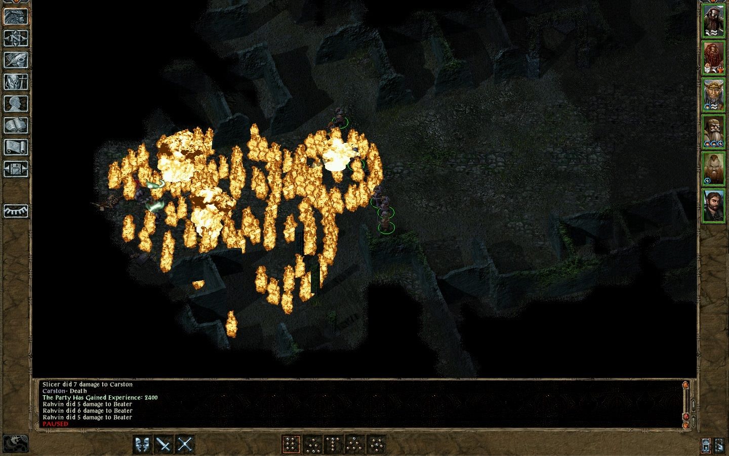 Key Event: After travelling down a long hall, battling Ghasts, five in all, & Imoen disarming another trap we found another room which was a false Exit Room w/a trapped staircase that Imoen disarmed. Imoen used her innate invisibility & moved across to a room that was @ about 2 O’clock from where we came out of the long hallway. Imoen checked out a bedroom beyond that she came back & reported was guarded by four more Dwarven Doom Guards & contained two chests. I decided to have Coran, Hide in Shadow & Move Silently to a place where he could toss an Oil of Fiery Burning in their midst. At the same time, Quayle was to use his Improved Invisibility to move into position to cast a Fireball down the same hall giving the Doom Guards a double dose of intense heat. Quayle jacked up his spell but Coran was on point with his & we coaxed three of the Doom Guards into chasing us up the long hall, through the Urn Room & back to the Teleport Room where we easily teleported over. When the three Dwarven Doom Guards caught up they couldn’t teleport & they were mindless, easy targets as we just blasted away @ them with a Lightning Bolt, Agannazar’s Scorcher & a Ring of Energy until they were no more. Then it was an easy thing to teleport back over & go clean up the fourth one who was still in the False Exit Room. We raided the chests & noticed what appears to be the door to the real Exit Room open as we passed through. We’ll come back to that later.