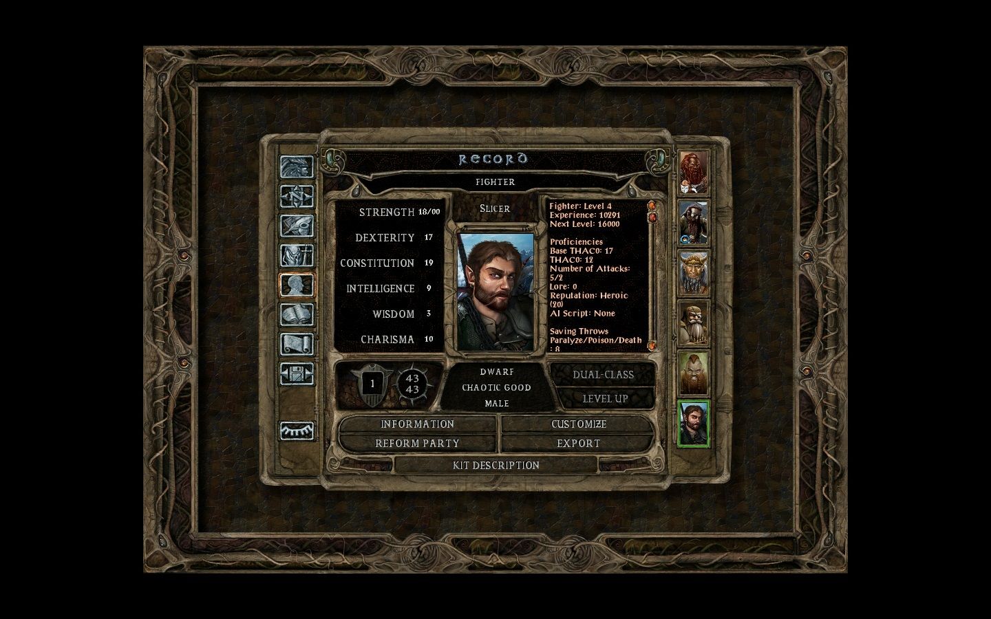 I've started a run as a Sharpshooter, Glîncúwen (Sindarin for shining-bow-lady), and decided to go with a party this time. I've rolled for good stats and gave my character a good Wisdom so I can later dual-class to Cleric (level1npcs' tweaks lets Clerics use any weapons, so you can choose according to your deity. In this case, my PC would be a priestess of Armtemis/Diana). I've put my proficiencies on Short bow & sword, IMO the best choices for a Thief in BG1. Thievings points were all spent in Open Locks and Find Traps, to put both skills at 40.