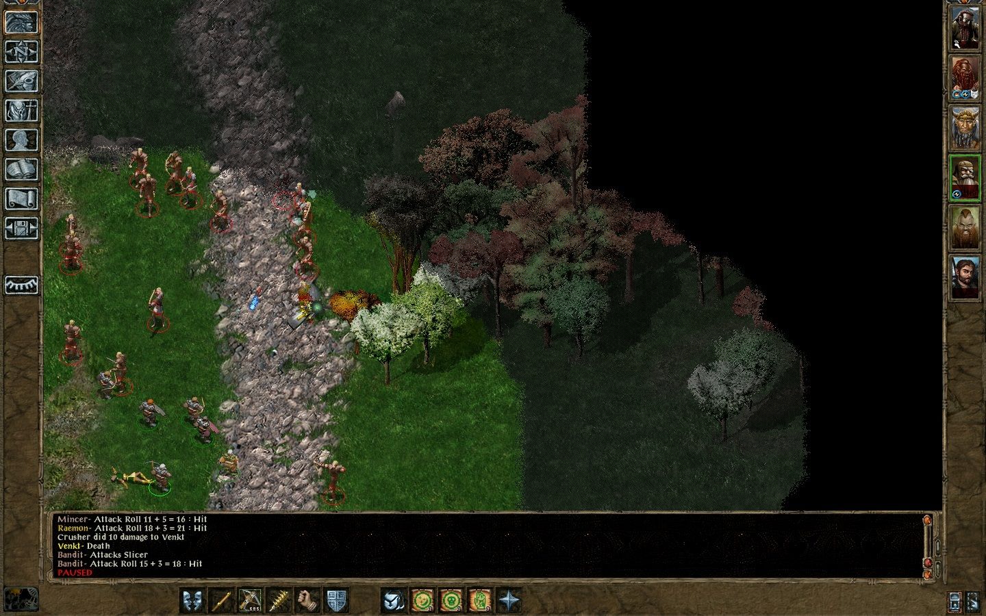 We raise Ajantins, purchase Throwing Axes for him to use, Darts for Quayle (I think Darts & Dagger are fitting weapons for a Priest of Braevar Shadowcloak) and (more) Arrows for Kivan and Glîncúwen, we talk to Bjornin and both Ajantis and Kivan agree in killing those half-ogres (this causes Crevs to remember he has to kill the belt-fetish rogue Ogre south of the FAI). Ajantis warns us about the Ogres and Quayle gained a level, but I don't notice that until much later. We give Quayle the Medium Shield +1 given to us by Bjornin and the Large Shield +1 to Ajantis and laugh at their banter. We decide to go to kill the rogue Ogre, and fight a bunch of Gibberlings in our path to glory kill the Ogre. In our way to the FAI we get ambushed by Worgs and half-ogres we kill them all by making Ajantis kite them while everyone else uses ranged weapons. I forget what I was after and go back to Beregost, we get a Quest from Mirianne and go to find her Husband's letter, but the game opposes violently... After that my computer crashed *too* because a segfault (probably caused by some trailing un-deallocated memory because of the game's crash... And yes, I'm a computer wizard if you were wondering that). I'll go play some more and try not to get killed by random encounters, I am not sure what I'll do next. Probably finish all the quests to get rewarded and then get a few levels to go to the Mines, or kill Silke and pick up Garrick.