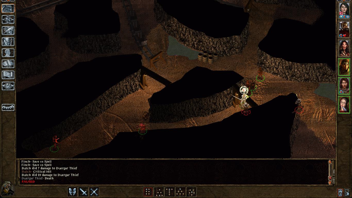 but that did not deter the others. Kagain got repeatedly poisoned by their assassin, until I downed the rogue.And then it was their turn to wreak havoc. They had not one but two priests in their midst, it turned out. In no time they held Isra, Imoen and Kagain, and they dominated Kivan.Packs of Kobolds must have heard the clamor of battle. Apparently they were in league with the Duergar, turning the odds even more against us. With only Finch and me left, I decided to distract our foes so that she could look after my comrades. I applied an oil of speed, returned to the second level, and saw dozens of Kobolds follow me there (effectively blocking the way back to the third level).With my Ring of Energy I thinned their ranks until I found a way down to the third level. There I took on the Duergar priests with sneak attacks. One of them cast a Cloak of Fear, forcing me to swig a potion of clarity, but in the end I prevailed.