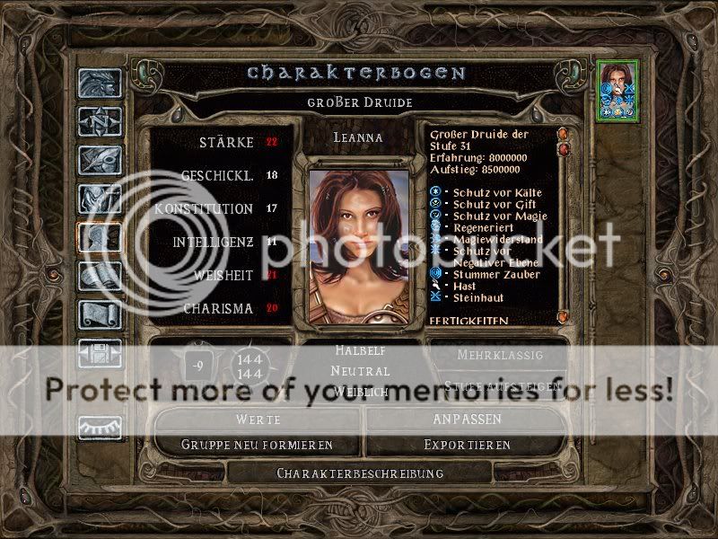 Leanna's StatsConcerning the Draconis battle, I think the way I finally defeated him was Indeed, after killing his Human Form with summons, sucessfully using both Natures Beauty for blinding him and Insect Plague to prevent him from Healing, then Summoning all powerful beings and attacking him until he's dead. The problem was pretty much only his magic resistance and me not having a way to lower it... otherwise, it would have been rather easy. Harm would also be a possibilty, I think, but the only bosses I defeated via Harm were Yaga Shura (which meant that he died after 2 seconds of combat) and the final boss (where I HAD to do it, because nothing else (besides extreme cheese) would help).