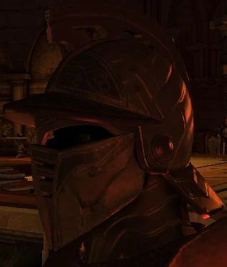 The helmet I really wish I could mod is the Corruption-style helmet, which looks rusty and mean and makes everyone's head look really small. I gave it to Loghain for the Archdemon fight because it's got 75% Spirit Resistance on it, but it so did not match with the River Dane armor set. Duty does, more or less, and Loghain wore that for most of my playthrough.