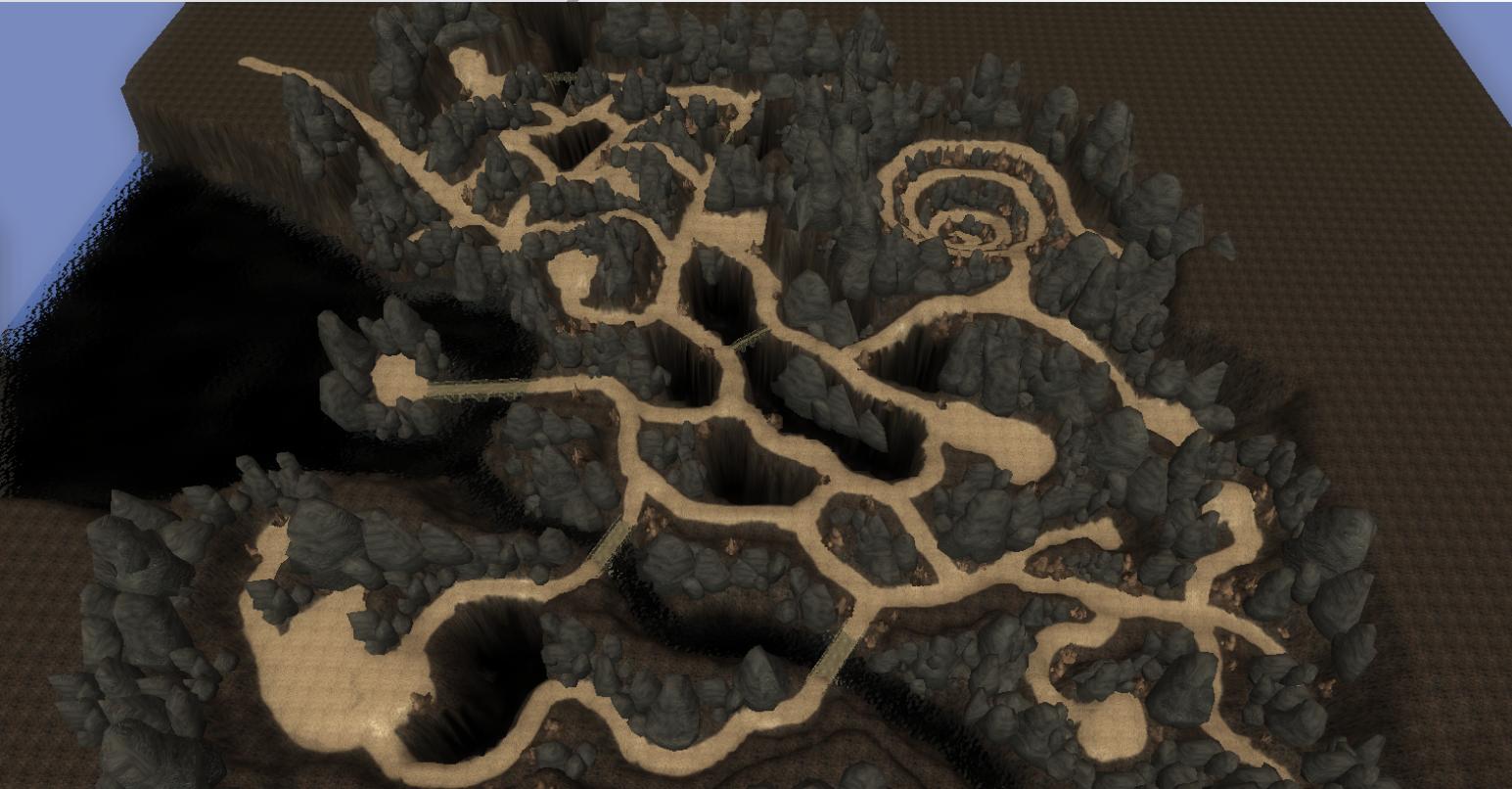 I considered putting in some rockfaces that block the camera's view of a path, this being a map of tunnels. Opinions on that? As it is now the path is basically freely viewable with a few small partial blocks of a path that a player would pass through within a second of travel, the outer northeast spiral would be an example of this.