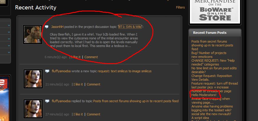 I'm not part of this project but the first part of the comments are showing up. The link (BT 1: SVN & Wiki) points to http://social.biowar...cussion/34/254/ but gives me a "You do not have sufficient privileges to view this topic." error.