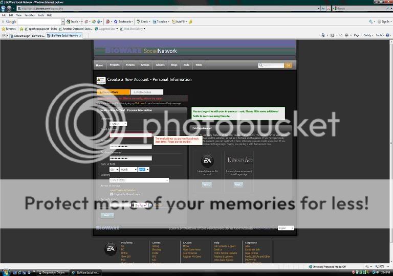 But when I try to log in to this social site which is SUPPOSED to be tied to my EA account I get that situation in the screen shot.