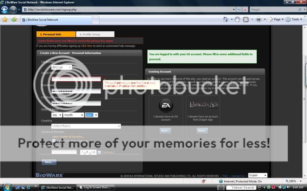 Please check out this screen shot for my exact problem. I have deleted my email and date of birth in this screenshot for privacy reasons but you will see the error message I get in Red. Notice to the right that it says I am currently logged in with my EA account which is the email address I am getting the error message with. It seems that the bioware site is not linking properly to my EA account like it is supposed to do.