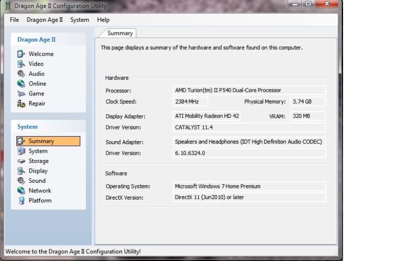 According to the brain surgeons at Best Buy my HP laptop should run DA2 with no problem. When I run the game the opening videos play then the first battle begins. During the first or second action the screen and sound freezes followed by a 'crash to desktop'. According to the game my system is: