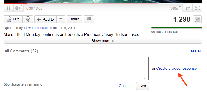 How do you submit a video-response? Go to this URL http://youtu.be/ce8WbE9dfHE and click the "Respond to this video..." box located underneath the video's information (the same place you would type a comment). A hyperlink on the right of the box called "Create a video response" will appear - click this link. You will be given two options for choosing your video response.