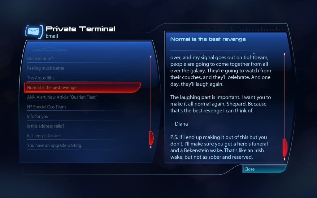 It also would have kinda been neat if Kaidan and Garrus or Thane ( whoever you romanced in 2, if did) would talk or something... doesn't have to necessarily be drama filled.... like Kaidan thanking Garrus for being there for her and keeping an eye on her ...or something.. idk.